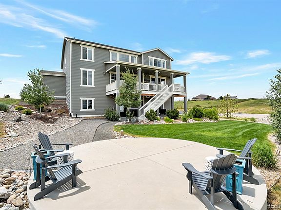 Beautifully set on five full acres you will be surrounded by rolling hills and Colorado wildlife in a quiet, serene setting. As you enter the home you will fall in love with all of the custom features this home has to offer. Just off the foyer you will find your formal dining room which opens into your butler pantry, making it the perfect space for entertaining. Continue into the chef's kitchen featuring a large center island, stunning countertops, stainless steel appliance package and a breakfast nook. This will open into your lovely family room with a cozy fireplace and large picture windows. Walk out onto the covered deck and you will find the perfect place for a cup of coffee in the mornings. The main level also offers a bedroom with an en suite full bath and another half bath for your guests and a home office. As you take the stairs to the next level you will be greeted by a large loft that could be used as a second family room, office, workout room and so much more. The master suite will amaze you with the beautiful views and spa bathroom featuring a large soaking tub and separate walk-in shower. Finishing off the master suite is a spacious walk in closet, big enough for two. Also on this level is two more bedrooms and two more full baths. Continue onto the lower level to find your walkout basement, unfinished and ready for your perfect plan. This opens onto a large, covered patio and into the beautifully landscaped yard including a paved space for your chairs and firepit, the perfect spot for stargazing. There is also a 2400 square foot outbuilding with plenty of room for all your toys, even your 5th wheel camper! Centrally located between Southlands and Parker you will be close to golfing, dining, shopping and more.