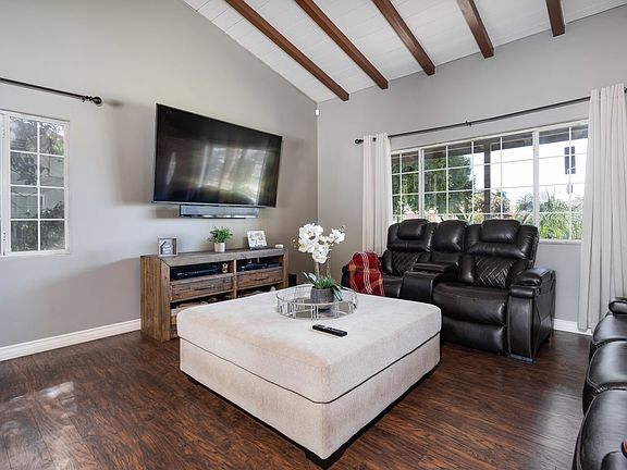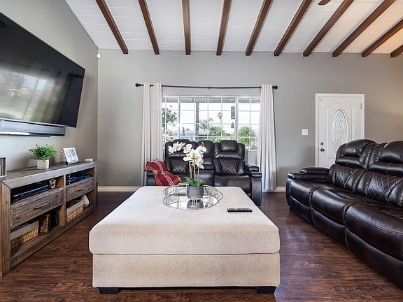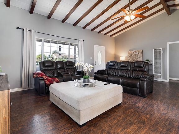 The perfect home to create new lasting memories in! Located in Pomona reside a gorgeous home with 3 bedrooms, 2 bathrooms and 1,452-SqFt of living space. The interior features an open floorplan with wood and tile flooring, high ceilings, crown moldings, French windows and even a laundry area inside the home! The living room nestled under a cathedral beamed ceiling is the perfect spot to relax or for entertaining. Enjoy prepping meals in a bright kitchen equipped with stainless steel appliances, granite countertops, beautiful wooden cabinets and a breakfast bar that is great for adding bar stools. The home also includes a cozy laundry area. Master bedroom has a private bathroom (newly redone) with a dual vanity sink. The property features a spacious front and back yard. The front yard has a large green lawn, and the backyard has an open space with a large patio and the detached 2-car garage. Close to popular dining options, markets, gas stations, as well as easy access to the freeways!