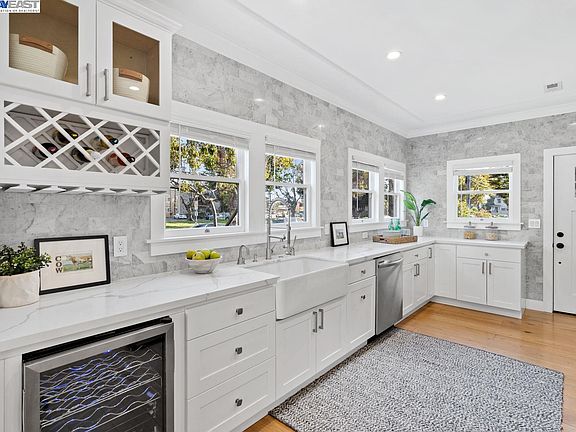 Built in 1920 and remodeled from top to bottom from 2021-2023, this spacious, 2-story East End home has style, curb appeal and location to spare! Situated on a generous corner lot just 1 block from Park St and across the street from picturesque Chochenyo Park, the home offers 4 BR, 3 BA, an open living room/dining room/kitchen combination + a finished basement for plenty of storage. Details include abundant natural light and hardwood floors throughout, 9-ft tray ceilings, a gas fireplace, recessed lighting and crown moulding. The kitchen & bathrooms have been remodeled with timeless contemporary finishes that are as beautiful as they are functional. The spacious main floor primary bedroom includes an ensuite bathroom & a walk-in closet w/custom built-in organizers. The home boasts a pleasing, thoughtfully designed floor plan ideal for entertaining or simply relaxing with family. A large, sunny front patio sits behind a charming picket fence, providing even more entertaining opportunities. Mature fig, persimmon and plum trees! This exceptional home provides vintage home lovers the rare opportunity to enjoy a vintage exterior with lovely curb appeal, and a nearly-new interior designed for a 21st century lifestyle - all in a sought-after East End location. Don't miss!