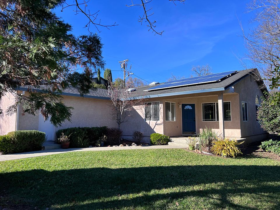 GREAT mid-town location--new carpet and fresh interior paint, walk to schools; owned 3.4w SOLAR system, Gas appliances/HVAC, attic fan, radiant barrier in roof, quiet street, handy to everything, low maintenance yard with pretty trees (Oak, maple, cedar, Meyer Lemon!) and 100+ year old outdoor stone fireplace, private leafy views from all windows, cozy porch, rear patio, W/D included, inside laundry, 3 skylights, natural light, high ceilings, alley access, graveled off-street parking, finished garage, newer kitchen appliances, & custom maple kitchen cabinets.