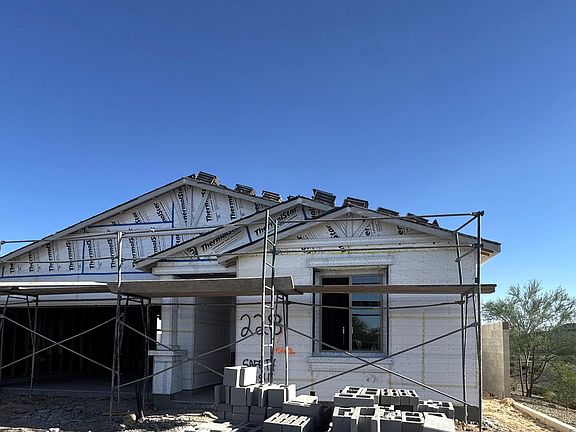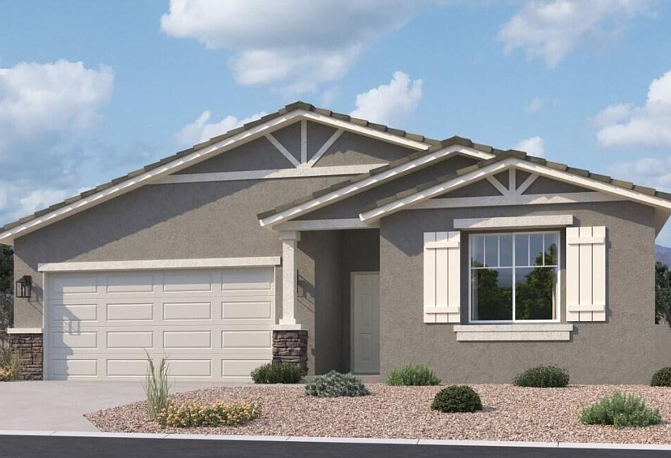 Step into refined living with this brand-new 1,953 sq. ft. residence, thoughtfully designed to blend modern style with everyday comfort. Offering 3 spacious bedrooms, 2.5 baths, and a versatile den perfect for a home office or flex space, this home embodies both functionality and elegance. The Roosevelt floor plan showcases elevated finishes throughout, including 42'' espresso cabinetry, a designer tile backsplash, and an oversized quartz island that anchors the kitchen. Stainless steel appliances, along with the refrigerator, washer, and dryer, are all included for effortless move-in convenience. Soaring 9-foot ceilings and an open-concept layout create an airy, inviting atmosphere, complemented by 8x36 wood-look tile that brings warmth and continuity through the main living areas. Plush carpet in the bedrooms offers cozy retreats, while 2" blinds throughout add privacy and polish. A 4-panel sliding glass door seamlessly connects the living space to a covered patio, ideal for relaxing evenings or weekend entertaining. With a soft water loop, 2-car garage, and carefully curated finishes, every detail has been considered to enhance daily living. Whether hosting guests, working from home, or enjoying quiet evenings in, this home delivers the perfect balance of luxury and livability.