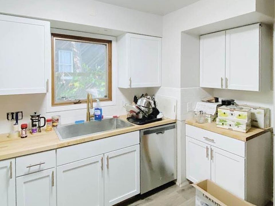 The kitchen was recently fully renovated and has two stainless refrigerators and a dishwasher. The main living spaces are fully furnished, including a large living room, dining room, and laundry room. The kitchen is equipped with cooking essentials, dishes, and small appliances.