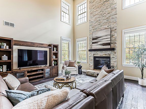 The heart of the home is the magnificent two-story great room. A dramatic stacked stone fireplace soars to the ceiling, while double-height windows on three sides fill the space with an airy, bright ambiance. A convenient second staircase provides additional access to the upper level.