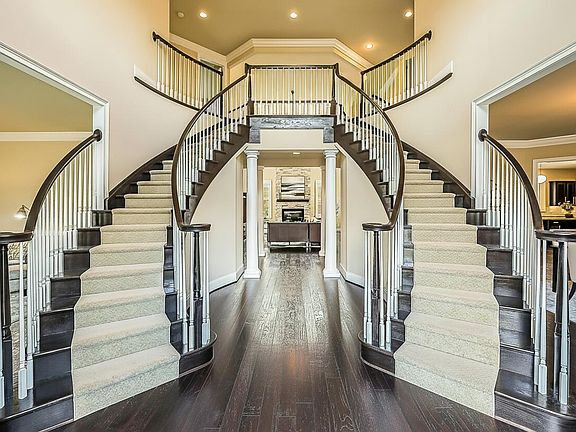 A breathtaking dual staircase greets you upon entry, setting a tone of grandeur that continues throughout. Rich hardwood floors flow across the main level, accented by stately architectural columns and intricate crown molding. The formal living room, bathed in natural light and detailed with classic chair rail molding, provides an ideal space for welcoming guests.