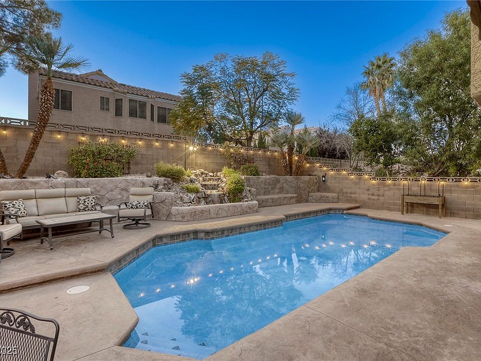 Resort-style backyard featuring a sparkling pool, soothing waterfall, fire pit, extendable awning and multiple umbrellas for shade. Newer electric pool heater. Whether you’re entertaining or relaxing, this space has it all.
