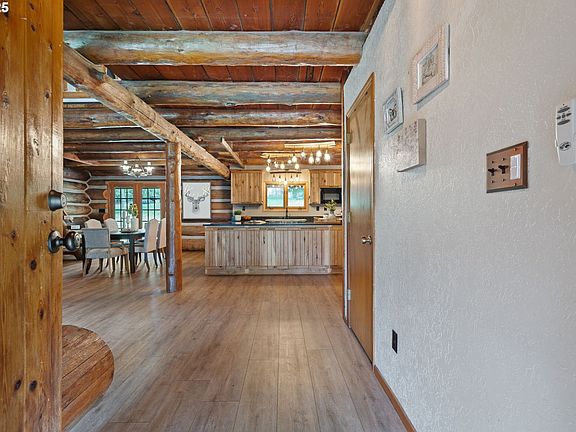 Tucked away on 5 incredibly private, wooded acres at the end of a gated driveway this this classic log cabin and grounds await. Vaulted ceilings, the centerpiece wood-burning fireplace, and loads of light coming in the large windows create that rustic cabin feel without sacrificing the joys of modern living: an updated kitchen with quartz countertops, a MASSIVE chef's island, and pull-out drawers and pantry, mud room, AC, and plenty of updates throughout. The main-level primary suite (first of two) provides a peaceful retreat with dual closets and a custom ensuite. Upstairs is a massive bonus room so everyone has space to spread out. Top that off with the RARE multigenerational living component and you've found a winner. Downstairs, a full second living space with its own kitchen, living room, bedroom, and private entrance creates true multigenerational living, ideal for guests or long-stays. With an XL, 2 story shop, a fenced garden, goat and chicken houses with separate runs, Bittner Creek running through the edge of the property, and more privacy than you can shake a stick at, you're not just buying a home, you’re choosing a lifestyle rooted in the rural, adventurous life you've been dreaming of!