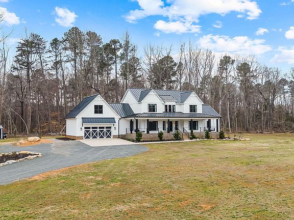 Modern Luxury meets Country Charm in this beautiful custom built 4 bedroom, 3.5 bath home. This tucked away treasure includes 13.21 acres of unrestricted land with lots of privacy and serene views of nature and wildlife. As you arrive you'll notice the large front porch with 2 comfy bed swings perfect for curling up with a good book. This charming home welcomes you in with a beautiful WOW factor of the open concept living area. This Gem is ideal for entertaining guests. Lots of natural light from the soaring ceilings and expansive windows throughout the living area and kitchen. You'll notice the massive marble ledgestone fireplace with complimenting marble ledgestone accents throughout the main floor. A see through fireplace provides luxury and warmth on the inside and outside onto the massive sun and grilling deck. This beautiful deck is set up for a potential heated inground pool as well. The inviting kitchen shows off with the marble countertops, island and farmhouse sink. Completing the perfect sized kitchen is a walk-in pantry with lots of storage space. Spacious areas such as the dining and additional flex space extending from the living room are ideal for entertaining. Pottery barn finishes throughout the entire home encompasses the modern touch with a country feel. The spacious primary bedroom suite on the main floor features 2 custom made modern barn doors. Flowing into the bedroom is a marble ledgestone accent wall which provides a luxurious feel. The spa-like bathroom suite is such an added bonus with the black hammered copper soaking tub as a focal point along with the adjacent walk in closet. With plenty of space for clothing and more natural light, it feels like you're shopping in your own boutique. Completing the main floor is a modern half bath and large laundry room. As you move upstairs into the loft area you'll find the 3 additional secondary bedrooms split with full bathrooms adjacent to them. As for the exterior, it's an outdoor-lovers dream! Serenity of nature expands throughout the property with natural springs flowing from the Eno River. Deer and other wildlife adore it as well. There's room for so much potential. Bring your horses, barns, animals, recreational vehicles, outdoor sports and make it your own! Have your outdoor fun right at home on over 13 acres without sacrificing the modern conveniences of nearby Chapel Hill and UNC that are just minutes away. After a day in the city, drive home to your tucked away treasure where you can relax and enjoy the outdoors. With plenty of room outdoors, there's space to grow gardens and fruit trees just to name a few. Just imagine what potential you'd have. This isn't just any home, it's an amazing home that has an entire lifestyle included! Tucked away treasures like this one are indeed rare, especially with Chapel Hill just minutes away.