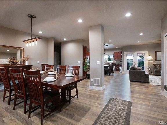 Discover this one-of-a-kind ranch home in Elkhorn Ranch located on 5 acres! The minute you drive up you will fall in LOVE with this stunning home! Upon entry, you'll find charming features, including a bright and sunny open floor plan, gorgeous kitchen with a center island, granite countertops, custom cabinets with pull down shelves, stainless steel appliances and kitchen pantry. The kitchen seamlessly overlooks the inviting living room with a gas fireplace, perfect for snowy nights & a spacious dining room, great for those holiday gatherings. The primary bedroom is a bright & airy retreat with large windows, walk-in closet that doubles as a concrete bunker, & its own HVAC zone. The en-suite has heated flooring, a luxurious walk-in shower, large whirlpool bath, double sinks with a beautiful remodel & unique backsplash. Each toilet has heated seats & bidets. All three additional bedrooms are well-lit & generously sized. The back patio with covered & uncovered areas for versatile outdoor living is perfect for summer nights; it’s surrounded by garden beds, lush grass & mature shade trees. Modern amenities include smart controls, luxury vinyl plank flooring, new roof & gutters & newly painted house & barn. The home features a natural gas backup generator, speaker pre-wiring in every room, automatic door openers, ADA/wheelchair accessibility & natural gas stubbed in two outside locations for future use. Additional features include dedicated electrical boxes for landscape lights and hot tub, a smart irrigation system, can lighting with built-in night light halos & adjustable color temp, upgraded steel flagpole & perimeter fencing. The multi-use 40x60ft outbuilding has 2 large horse stalls with ample hay storage on one side, & sectioned off to the other side is a loft, storage room and a roughed-in restroom & kitchenette. This home blends charm, luxury, & modern convenience. Close to schools, trails, restaurants, E-470 & more. Don’t miss out on owning this WONDERFUL home!!