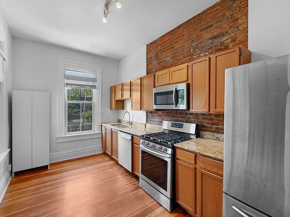 Updated kitchen with gas stove and stainless steel appliance package, in-unit laundry, wood flooring throughout, large living room big enough for a sectional couch, bedrooms have exposed brick, and backyard perfect for pets.