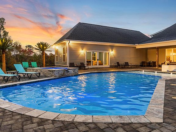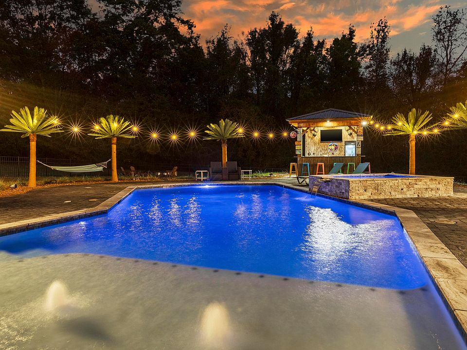 Outdoor amenities abound: jump in your self cleaning pool to cool off or relax & soak in the hot tub, lounge on the tanning deck, or gather around the tiki bar—equipped with a TV, sink, beer tap with kegerator, refrigerator, and ice maker. The fenced-in yard offers safe play for pets and children with room to roam. The expansive barn accommodates livestock, yard equipment, or all-terrain vehicles. Step out on your custom made basketball court and stay active with some hoops.