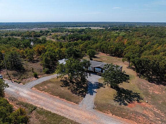 Want to own a little piece of Heaven where you can watch the deer dance during our incredible Oklahoma sunsets?? This 4 bedroom, 2 bath home is situated on 5 wooded acres and includes a 26x28 Shop/Garage on a concrete pad that includes electricity and a 8x16 electric door. It's country living at its finest. Sit out on the deck and overlook your own slice of Oklahoma paradise! Just a skip to Lake Thunderbird, you could not ask for a better spot for an outdoor enthusiast or nature lover. This gorgeous manufactured home includes a beautiful great room, spacious dining, living, and kitchen right in your view. The kitchen features a large island, stunning wood ceiling, and gorgeous white cabinets and backsplash. You will love the rustic touches all through the home. The huge primary bathroom features a double vanity, walk-in shower, and separate tub. To top it off, there is a storm shelter to give you peace of mind in our Oklahoma storms!