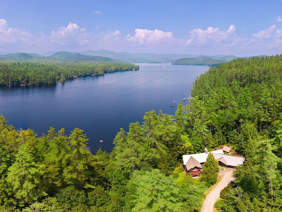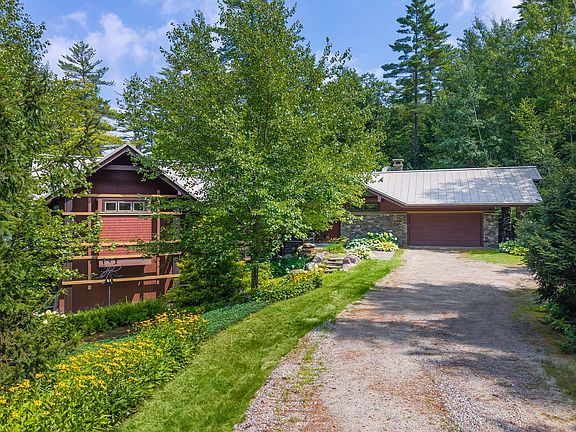 Nestled gracefully among stunning granite landscapes and backing onto 44.35 acres of conserved land, this lakefront retreat has been expertly designed by Boston architectural firm Dimella Shaffer to showcase Maine's breathtaking beauty and rugged charm. Seamlessly integrated into the natural surroundings and inspired by Kezar Lake's rich cultural and recreational heritage, this rustic yet contemporary masterpiece features reclaimed wood accents, natural cut stone, and standing seam metal roofing with large overhangs, creating a truly unique living space. Every detail has been thoughtfully considered in the spacious interior, which includes a chef's kitchen equipped with Viking, Subzero, and Bosch appliances, a central island, expansive prep areas, and ample custom-built storage. An inviting elevated deck, complete with a spacious screened porch, can be conveniently accessed from the bright, airy kitchen. This seamless indoor-outdoor connection provides an ideal setting for both relaxation and entertaining. The open-concept living and dining area boasts a two-story vaulted ceiling, highlighting a double-sided stone wood-burning fireplace and offering captivating views of the surrounding evergreens and glimpses of Lake Kezar. The main level features a commanding primary suite, surrounded by large windows topped with transoms that flood the room with natural light. It also includes a luxurious primary bath and a walk-in closet. An additional bedroom suite is located at the opposite end of the home. A floating staircase leads down to the lower level, which includes a family and game room with the same impressive double-sided stone fireplace as upstairs. This space also contains two additional guest bedrooms, a full bath with beautiful, tiled walls, and an exterior door that provides access to the path leading to the water. At the water's edge, a fully equipped one-bedroom cottage features sliding doors opening to a lakeside dock and swim platform.