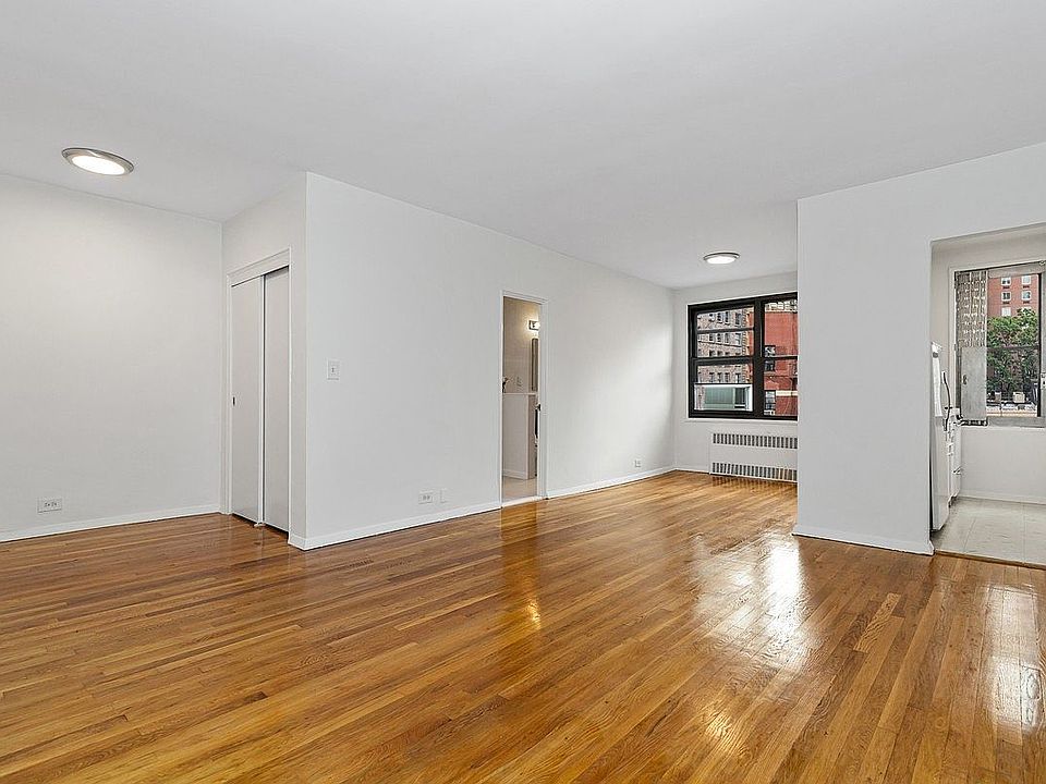 Covetable oversized alcove studio with sunny East exposures. The large, square shaped living room easily accommodates multiple living arrangements and is adjacent to a king-size sleeping alcove outfitted with CitiQuiet soundproof windows. Both the kitchen and renovated bath with adjacent dressing room are windowed. There are new stainless appliances in the kitchen and a dishwasher may be added with board approval. The spa-like bath is outfitted with Roca tiles, Century Bathworks mirrored storage and Grohe fixtures including a rainfall head with hand wand.