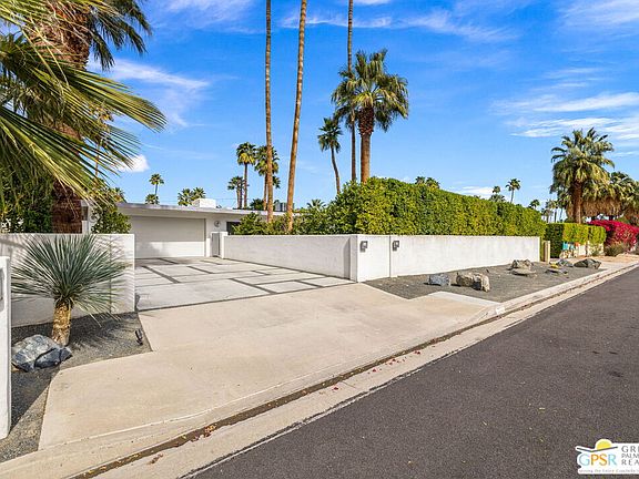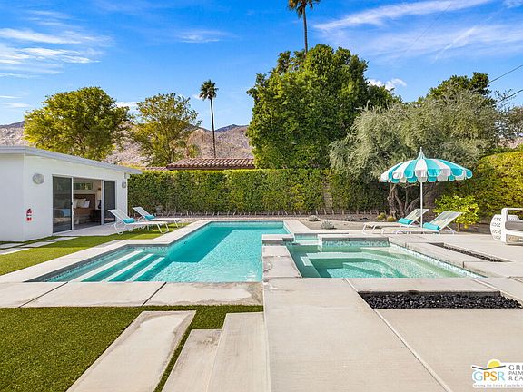 Iconic 4 bed 4 bath Mid-Century Modern home in Tahquitz River Estates SHINES! Highlights include a light and bright open floor plan, fantastic separation of bedrooms, modern design finishes such as quartz counters and porcelain tile throughout, and two resort-style outdoor areas that deliver fantastic mountain views! Multiple HVAC units, dual tankless water heaters, and solar panels make this an easy one to enjoy! Close to downtown, no HOA nor land lease fee, and eligible to be a short-term vacation rental. Yes, this one does have an impressive vacation rental history AND the owner is willing to sell the inventory outside escrow. SIMPLE, right? Clearly this stylish home is the one to see! South-facing private front yard delivers BIG mountain views, mature landscaping, and gas fire pit. Inside, fall in love with the modern kitchen with large, detached island that opens to the living and dining areas that lead directly to the front and back yards. You will love the covered patio that leads to the resort-style pool and spa. Views, views and more views! Spacious Primary Ensuite, which opens to the pool and spa, has a private ensuite bath with dual sinks and a walk-in shower. On the other side of the house are Junior Ensuite Two which offers views, access to the pool and spa, and a private ensuite bath with dual sinks and a walk-in shower; Junior Ensuite Three with views, access to the south-facing front yard, and a private ensuite bath with a walk-in shower; and Junior Ensuite Four with a private ensuite bath that includes a sizeable walk-in shower. Inside laundry area, plenty of storage, and direct access to the attached two car garage.