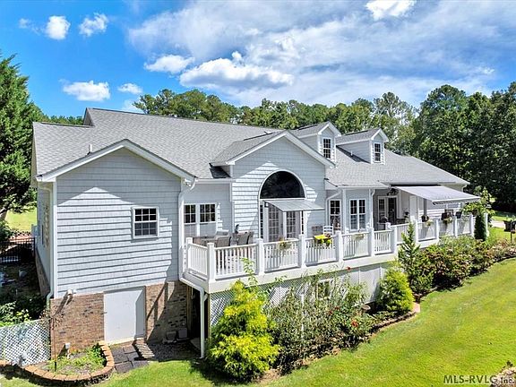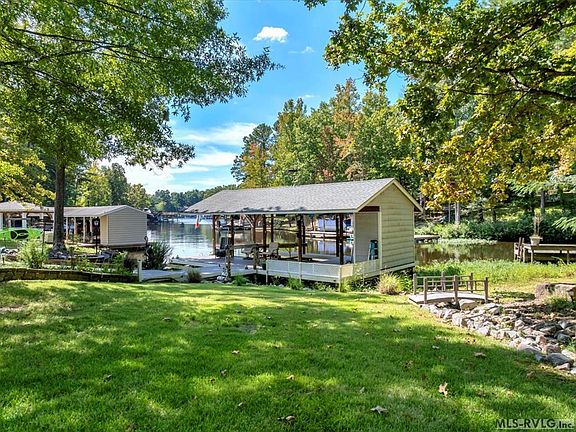 Classic, comfortable living meets an easy lakefront lifestyle on the shores of Lake Gaston. The impeccable curb appeal will draw you in, then step inside to discover a welcoming foyer, high ceilings & inviting archways. The main level boasts 2,407 sq ft of thoughtfully designed living space, including two spacious living areas, a formal dining room, home office, laundry room, and a gourmet kitchen complete with granite countertops, a large pantry, and newer appliances. The private primary suite features a generous bedroom, double vanity, walk-in shower, large closet, and a bonus flex space—perfect for a second office or cozy sitting area. Two main-level guest bedrooms share a Jack & Jill bath, with one offering direct deck access and serene lake views. Upstairs, you'll find a 930 sq ft guest suite featuring two undesignated rooms, a full bath, and a large living area—ideal for guests or a separate work-from-home zone. Enjoy lake life from your composite lakeside deck with vinyl railing and an electric retractable awning. The lawn & landscaping are thoughtful, tasteful & generous with a park-like feel featuring a lush Zoysia lawn. Access the lake on a meandering, gently sloping, concrete walkway leading to the private single boathouse. Dock includes a boat lift, lounge deck, and storage shed. The .85-acre lot features 105 feet of Dominion waterfront on a main lake cove, offering direct access to the main lake. Other extras include: oversized 2-car garage with tons of storage, large attic storage, new septic field (2024), irrigation system, black iron fenced yard, solar-powered entry gate, and on-demand hot water. Everything you see conveys. This desirable NE quad location is close to all Lake Gaston amenities.