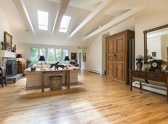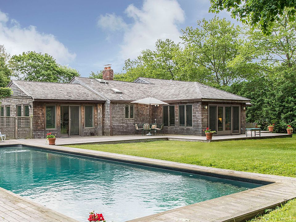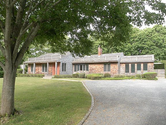 Set on a shy three-quarters of an acre South of the highway, in Bridgehampton Village on desirable Ocean Road and across from the Bridgehampton Golf Club, this stylish and comfortable updated one level home has it all. The bright, white living room with cathedral ceilings and stone fireplace has large windows and glass doors that flood the space with natural light. The formal brick-floored dining room is located in a wing off the living room and has large windows on three sides and glass doors opening to the deck and lawn. Interior folding wooden screens cover the window walls for privacy or shade when desired. The sleek kitchen has granite countertops, stainless steel appliances, wood floors and crisp, white cabinetry; there is also a breakfast area. The family room/den and media room provide additional living space. The master bedroom suite has its own set of French doors to the deck and lawn. There are three additional bedrooms and three more baths. The home is surrounded by spacious, open lawn areas with tall privet around the perimeter affording privacy. Ideally situated in a coveted location, this chic home gives you easy access to Bridgehampton's shops, restaurants, Jitney, as well as nearby ocean beaches.