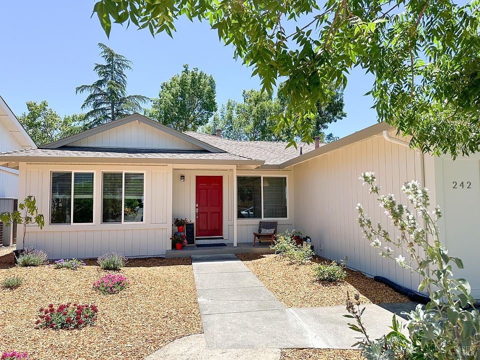 Find your way to this hidden street in Healdsburg where neighbors are truly friendly and welcoming. This sweet single-level home offers the perfect opportunity to secure a home in a super location for a surprisingly reasonable price. Stroll right in through the sunny landscaped front yard with cheerful greenery and vibrant flowers and into this well-laid out home with pride of ownership. The sunny recently landscaped front yard boasts lush greenery and vibrant flowers. Fresh paint inside and out, new concrete driveway sections in front and a recently replaced electrical panel are some of the benefits for the new owner. The house offers an efficient floor plan, from the bright living room to the cozy kitchen and dining area to the family room, just steps away from the back deck. The primary suite with its remodeled bath also opens to the deck, where mature trees create dappled light and shade for the terraced yard and patio, perfect for gardening or relaxing, outdoor dining and summer fun. Look out to the view southwest from the deck or upper terrace, rest in a hammock or tend vegetables and flowers under the pear tree. Make your way to the Farmer's Market on Saturday morning by the back streets and become part of this amazing neighborhood!