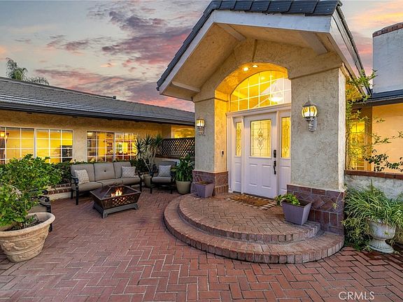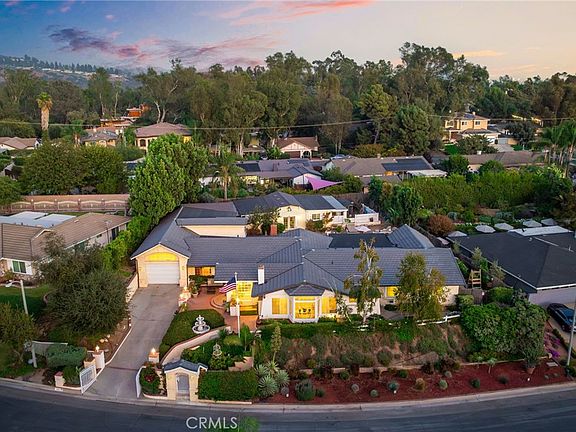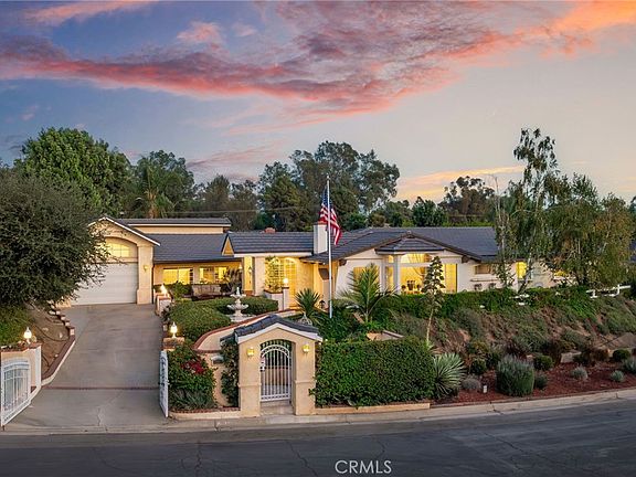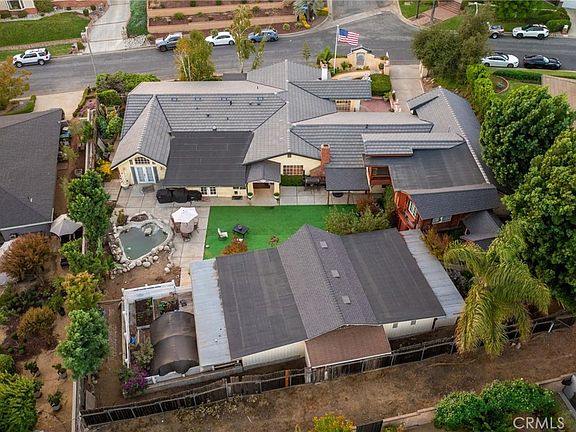 Sprawling single story home situated on an elevated lot with a gated driveway. A manicured front yard with steps leads to a beautiful herringbone brick courtyard and the front entry door. The front door opens to a tiled foyer and to an spacious living room with open beam vaulted ceilings, picture windows overlooking the front yard, a fireplace with river rock surround, and an adjacent formal dining room just steps from the kitchen. The remodeled kitchen is oversized and offers rich wood cabinetry, top-of-the-line stainless appliances including double ovens, dual warming drawers, two refrigerators, and dishwasher drawers. The large center prep island with butcher block counters and a sink centers the kitchen's cooking area and is lit with pendant lighting. A peninsula also open to the kitchen, offers countertop seating and backs up to the large breakfast nook offering a custom fireplace, built-ins, and exposed beam ceilings. Step into the family room featuring tiled flooring, a full wall with a built-in media center, recessed lighting, surround sound, and windows overlooking the front yard. A show stopping custom built bar features plenty of seating, beautiful craftsmanship, a coffered ceiling with copper inlay, a refrigerator, glass shelving and an adjacent pool table with a hanging pool table light. The primary bedroom down the hall offers a fireplace, built-ins, a retreat with a built-in media center, vaulted ceilings, and French doors to the backyard. The ensuite primary bathroom offers a sink with plenty of countertops and storage space plus a shower/tub. There are three additional bedrooms downstairs, one with a built-in wet bar and patio, and one with an ensuite bathroom perfect for an in-law living quarters set up. Upstairs there is an open studio like room with an enclosed patio offering nice views. The attached tandem garage could hold up to four cars and there is a workshop adjacent. The backyard features artificial turf, two covered patios, a koi pond, a fire pit, and two additional structures. The barn offers a workshop area, a room used as a second entertainment room, and a chicken coop. The chicken coop extends to an outdoor area as well and the barn backs up and opens to the bridal path directly behind the property. The second detached structure is a redwood cabin, cozy inside but has a small room and a sitting room with a fireplace. The Boral concrete tile roof and PEX plumbing were recently installed and are still under warranty. Zoned A1