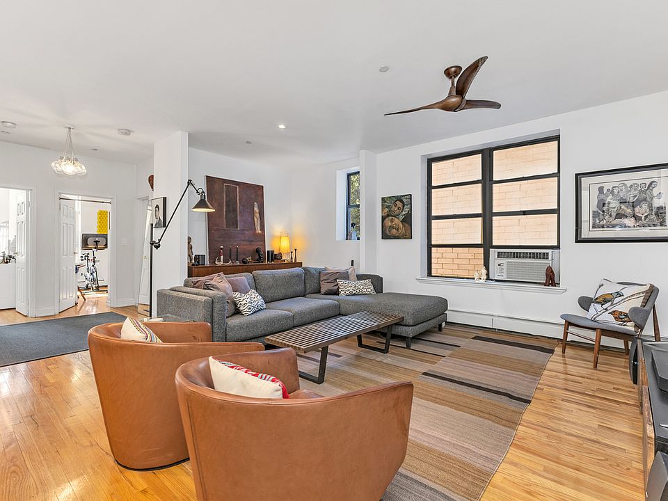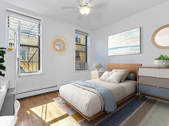 The flow-through kitchen provides generous cabinet space perfectly set wood butcher block table, and an open flow to the dining area and spacious living room. Hardwood floors surround this prewar walkup third floor home. A washer and dryer room is located within the building's basement.