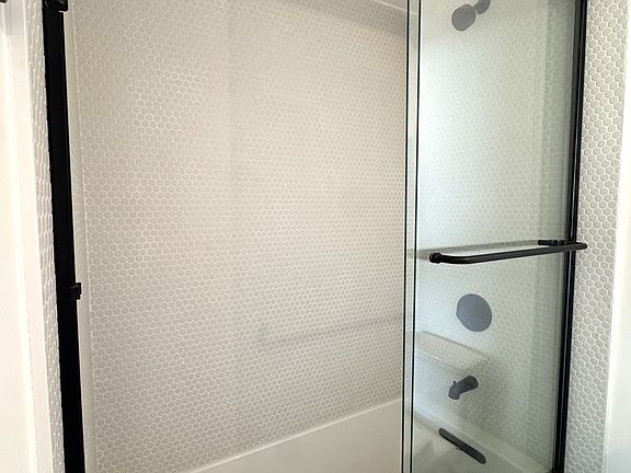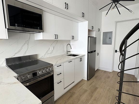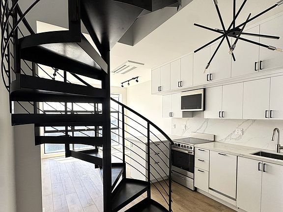 The apartment features wide-plank flooring throughout the living space, a contemporary kitchen with stainless steel appliances, quartz countertops, and custom cabinetry, as well as matte black fixtures and hardware for a clean, modern finish. Enjoy the added comfort of air conditioning and the convenience of an in-unit stackable washer and dryer. Expansive industrial-style windows bring in abundant natural light, while the elegant bathroom includes herringbone tile flooring, a floating vanity, and a frameless glass shower.