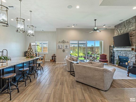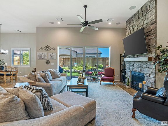 This stunning property boasts an open floor concept, perfect for entertaining guests or spending quality time with family. The centerpiece of the living area is a magnificent floor-to-ceiling stone stack fireplace, adding warmth and charm to the space. The luxurious master bathroom is the epitome of relaxation featuring dual sinks, a walk in shower with floor to ceiling tile and bathtub. The Kitchen has an oversized island where everyone is sure to gather. The pocket office makes working from home a breeze., Stepping outside into the backyard is a green oasis complimented by a covered patio. Last but not least is the 3 bay garage perfect for storing everything from cars to the extra holiday decorations. In this quiet neighborhood you will find many walking trails and even the occasional wild mustang! This home is a part of the Bella Vista Ranch Community and includes access to their rec room, pool, hot tub, community area, and gym. Available to host parties and used as an extension of the community. Only a short drive to Lake Tahoe, the airport, and the Tahoe Regional Industrial complex home to Tesla and many other companies.