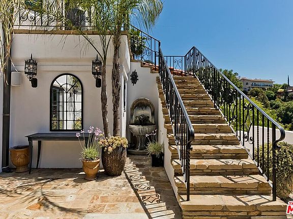Meticulously curated Spanish stunner perched in the coveted hills of Los Feliz. This fully furnished entertainer's home features multiple indoor and outdoor living and dining spaces to optimize the California lifestyle. Panoramic views of the Los Angeles skyline visible from almost every room and multiple patios provide a jaw-dropping backdrop to everyday living. Upon entry, the formal living room anchored by a massive stone fireplace boasts original beams, a baby grand piano and designer furniture. Across the foyer sits the formal dining room complete with seating for 8 and windows flooding the room with light. A large chef's eat-in kitchen with ample storage and counter space opens to the picturesque back patio with outdoor dining and living. The main level bedroom, currently furnished as an office, offers a convenient and private workspace nearby to a full bathroom with designer tile. Up the colorfully tiled stairs sits the primary suite with a large en-suite bathroom with a walk-in shower and large soaking tub adorned with windows. Two additional guest bedrooms, one featuring a stunning front facing patio, and two full baths complete the second story. The lower level boasts a large family room with a bar, rich coffered ceiling and french doors to the sunny patio with views. Double doors open to an exquisitely designed office with plenty of built-in storage and regal fireplace. A spacious gym with views, a beautiful spa-like bathroom and attached two car garage complete this amazing property.