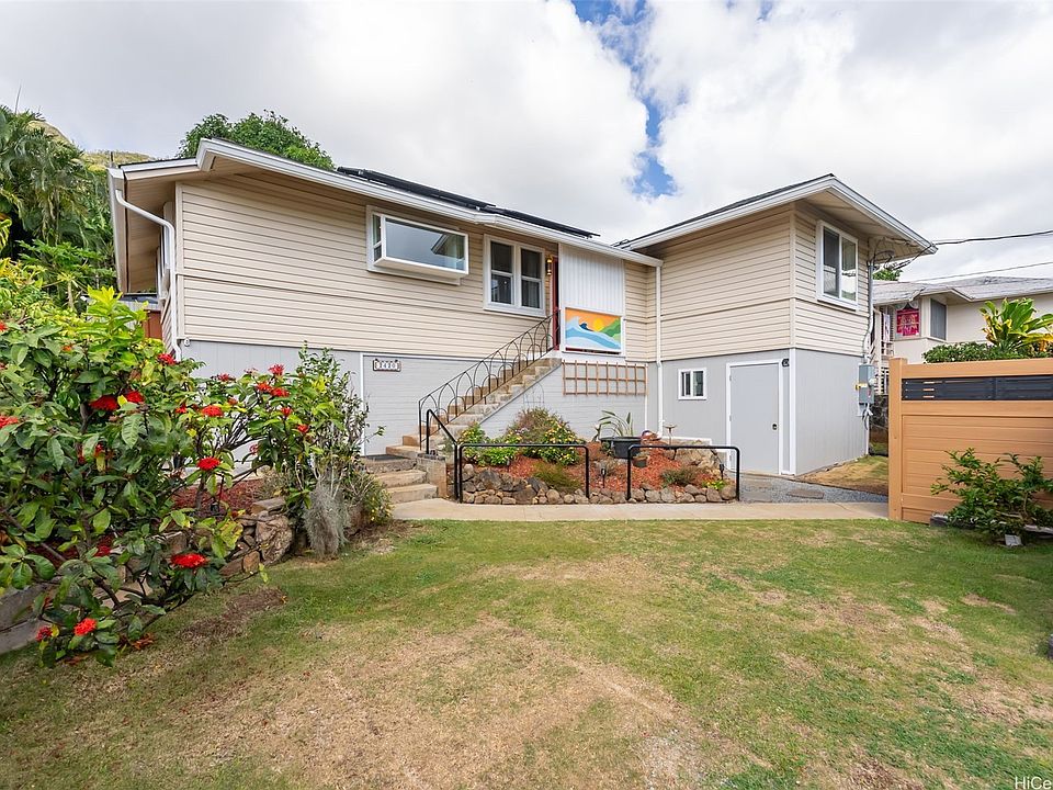 Fully renovated 2-bedrm, 2-bath home in Palolo Valley offers the perfect blend of modern comfort & eco-friendly living. Updates include double-wall construction w/ insulation, new roof, 200A electrical, copper plumbing lines, vinyl windows, & all-new cabinetry, countertops, vinyl plank flooring, split AC, stainless steel appliance, vinyl windows, and wifi-enabled lighting & ceiling fans. Energy-efficient with Tesla solar panels, a Powerwall, and whole-home battery backup. 5,200 sq. ft. lot includes a manicured level backyard—ideal for outdoor gatherings, gardening. Large basement with ample storage space or the perfect workshop. Enclosed vinyl fencing ensures privacy and provides a safe space for children or pets. The large laundry/pantry room offers additional storage, and the potential to convert into a third bedroom which adds flexibility to meet your needs. Panoramic views of Palolo Valley, Diamond Head, and the ocean. Yard filled with bamboo, flowers, avocado, jabong, lemon, papaya, and starfruit trees. Conveniently located near Waialae Avenue's shops and eateries, this hidden gem offers the best of both worlds—peaceful seclusion with easy access to urban amenities.