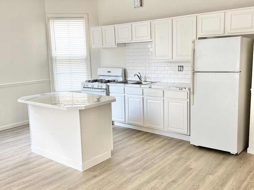 Newly renovated unit, light floors, white walls, open studio floor plan. Central heat and window air unit. $1350 rent (includes all utilities except internet). Small cats and dogs allowed, under 25 lbs. $25 monthly cat and dog fee, and $200 non-refundable fee one time. No smoking and one parking spot in the back for this apartment. Street parking available. Balcony off the bedroom in back.