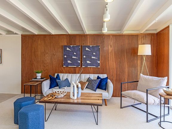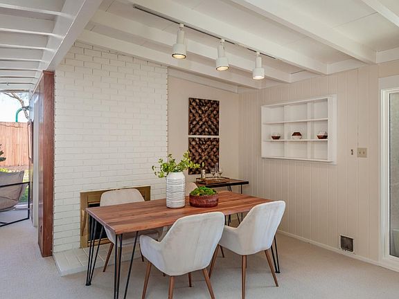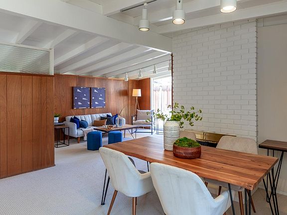 Make a fresh start with this Mid Century charmer! This home offers 4 bedrooms, plus a separate office, a dining area with fireplace and a flexible floorplan. Bright and airy, it offers classic Mid Century features like floor-to-ceiling windows, vaulted open beam ceilings throughout, and wood wall panels in the living room and office. The living room is open to the kitchen and dining area and has floor-to-ceiling windows + door to the backyard with garden views. The open kitchen has new flooring, room for casual dining, and floor-to-ceiling window and door to the side yard. The bedrooms have double pane windows, new carpets, and lighted closets. Other features include fresh paint inside and out, inside laundry, insulated foam roof, fenced in backyard with orange tree and patio, one car garage. All in the desirable Monta Loma Neighborhood, conveniently located close to Google, commute routes, train station, and elementary school. Not far from Downtown Los Altos and Downtown Mountain Views' restaurants and special events, and the new Showplace ICON Movie Theatre with kitchen & bar in the Village at San Antonio shopping center. Don't miss this well located, affordable home!