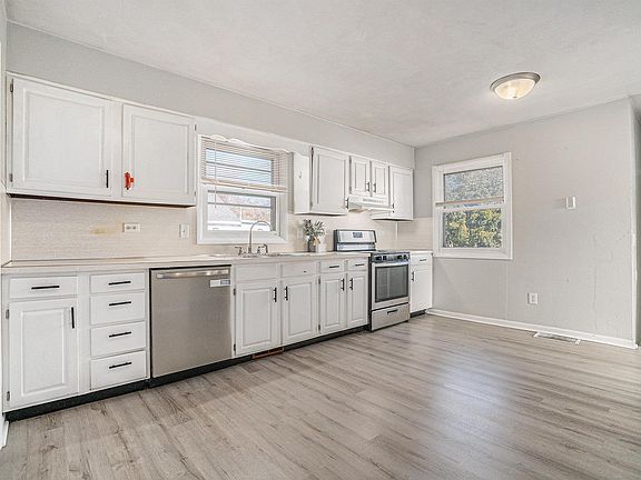 Finished basementFenced yardDetached garageGenerous white kitchenThree bedroomsStainless steel appliancesUpdated spacious one-and-a-half-story home