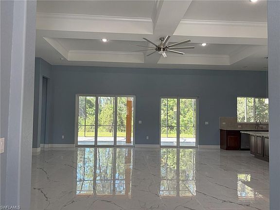 Welcome to this spectacular custom-built home located in one of the most desirable neighborhoods in Bonita Springs. This spacious and airy 2024 residence features 12-foot ceilings throughout, with soaring 14-foot ceilings in the foyer, dining room, great room, and den/bedroom—all beautifully accented with crown molding. The luxurious primary suite showcases oversized porcelain tile flooring, an 84-inch dual-sink vanity, and a large spa-style frameless shower. The generous layout also allows space for a cozy sitting area. The expansive kitchen is ideal for entertaining, offering a massive island and abundant cabinetry for storage. The guest bedrooms are spacious and inviting, including one with an en suite bath that conveniently opens to the lanai for easy outdoor access. Additional features include impact-resistant double pane casement windows, an energy-efficient tankless water heater, a smart cooktop, extensive lanai and more. The property is connected to central water and also includes a well system for irrigation with automatic sprinklers. San Carlos Estates offers a tranquil and idyllic setting in the heart of Bonita Springs with no HOA and Flood Zone X —just minutes from Coconut Point, Barefoot Beach, shopping, and fine dining.