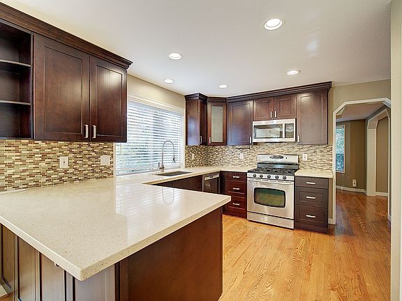 Available now! Beautifully updated Klahanie home on a prime corner lot in a quiet location. Spacious living, formal dining and hardwood floors. Kitchen showcases quartz countertops, stainless appliances, espresso cabinets, and modern finishes. The luxurious primary suite offers heated floors, quartz countertops, a deep soaking tub, and a rain shower. Enjoy the entertainment size Trex deck, yard and mature landscaping. Newer washer & dryer, high efficiency furnace, and recently installed triple-pane windows. 2 car garage. A nearby trail from the cul-de-sac leads directly to Yellow Lake. One dog under 40lbs okay with additional deposit.