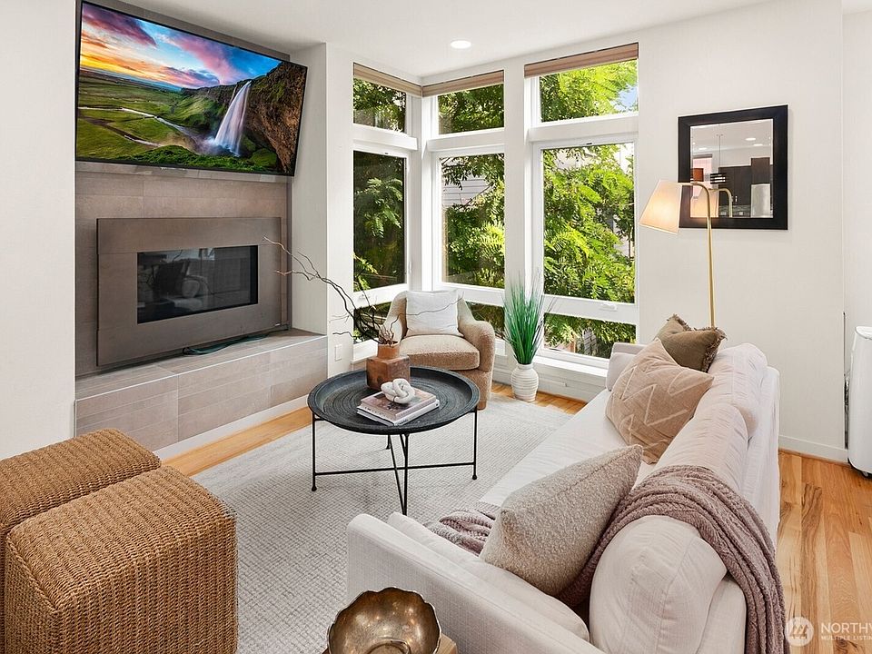 Experience elevated, urban living in this sophisticated 3 bed/3 bath Ballard standalone home. Floor to ceiling windows awash sunlight across an open concept main floor: hardwoods run throughout chef's kitchen w/gas range & island seating, dining & living room w/gas fireplace + powder room. Expansive primary suite on upper level offers total privacy: large walk-in closet, spacious ensuite bath w/double vanity & luxurious XL shower. Enjoy breathtaking city views from the roof top deck: perfect spot for hosting OR relax on your backyard patio w/fully fenced yard. SMART wired lights, thermostat, blinds & locks. Blocks from shopping, dining & transportation (walk score of 94). Deeded off-street parking. No shared walls!
