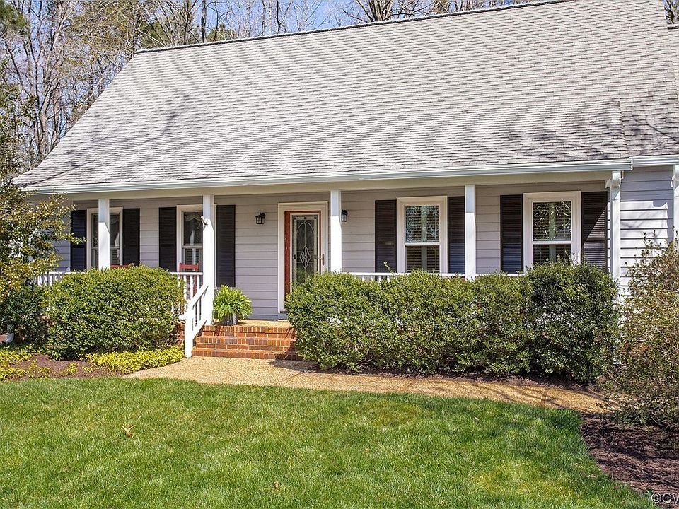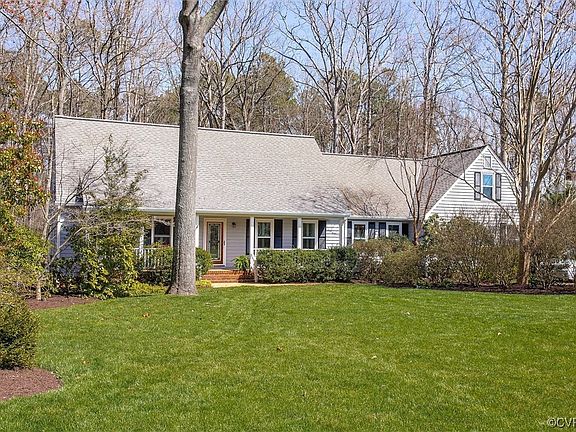 This charming cape with a country front porch boasts a first floor primary, a park-like yard that is over an acre, and is located in Bon Air! The front yard is level with lush grass and a large aggregate driveway with guest parking. The back yard has a beautiful stone patio and fire pit conveniently located off of the maintenance free deck. Walk inside and you immediately notice the warm hardwood floors, spacious room sizes for entertaining or family living. The first floor primary is tucked back off of the family room. Adjacent is the 2nd bedroom. It is ideal for a study or a nursery. This could be your primary suite! Upstairs you find 2 large bedrooms filled with natural light. They are finished off with ceiling fans and 2 walk-in closets each. Connected to one of the bedrooms is a large den/playroom complete with a bathroom, and bar-sink. The sellers have used this bedroom and connecting room for multi-generational living in the past. This well maintained home has all replacement windows, white painted cabinets and granite countertops in the kitchen, updated light fixtures throughout, gutters w/ shutters and renovated bathrooms.