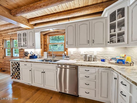 Located at the end of a gated waterfront community, this custom log home offers the rare opportunity to enjoy nearly two acres directly on Nolin lake. A paved drive leads to the home, where you'll find both wooded and lake views from the expansive decks, new landscaping, stone walkways, and a fire pit perfect for outdoor gatherings. Inside the home features refinished wood floors, a newly updated kitchen with modern appliances, new countertops, backsplash, and hardware. A sunken great room with a 24' vaulted ceiling, exposed log rafters, and a new fireplace offers the perfect spot to relax. The main level includes a large bedroom and updated bathroom. Exploring upstairs, a spacious loft offers additional sleeping quarters. Second floor provides a primary suite complete with updated bathroom including soaking tub, shower and walk-in closet. A second bedroom and full bath complete the second floor. The walk-out lower level has been fully finished to add two more bedrooms, a full bath, and additional living space. Enjoy lake views from the deck or take the paved ATV path to your private lake access with two upgraded composite docks. A 12x16 guest cabin and a detached three-car log garage with a covered porch complete the property. Additional improvements include a new roof, full exterior stain, new doors and lighting, a Sonos sound system, whole-house generator and new carpeting. This home is turnkey, being sold fully furnished and ready for year-round enjoyment. Contact listing agent for private showing. Option to purchase boat lift and side-by-side. See full list of improvements.