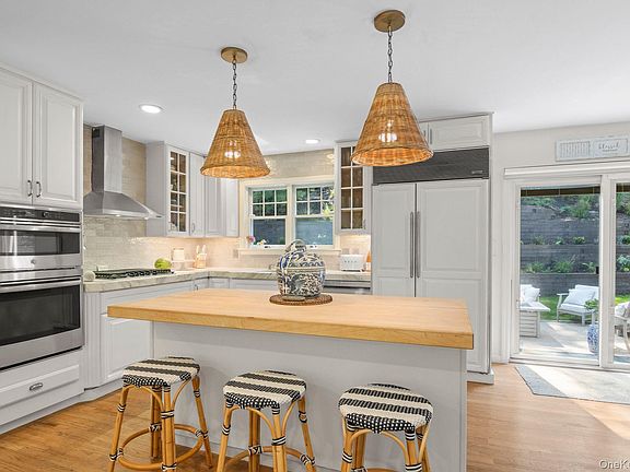 The first floor also features a powder room and laundry area, spacious living room, and a bright eat-in kitchen featuring marble counters, center island with breakfast bar, and Sub-Zero refrigerator.