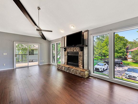 Tucked away at the end of the Tree House Condo community, this lovely home offers peace, convenience, and style—all within walking distance to Pawnee Prairie Park. Step inside to find beautiful wood floors, updated fireplace tile, and a warm neutral décor. The vaulted, beamed ceiling and large windows fill the open living and dining area with natural light, creating an inviting space for everyday living or entertaining. The kitchen includes all appliances and features a convenient eating bar. Upstairs, the loft makes an ideal guest room or office. The lower level offers two comfortable bedrooms, a full bathroom, and a laundry area. The spacious primary bedroom includes double closets and handy under-stair storage. Enjoy low-maintenance living with access to the neighborhood swimming pool—ready for you to relax and unwind this summer. Welcome home!