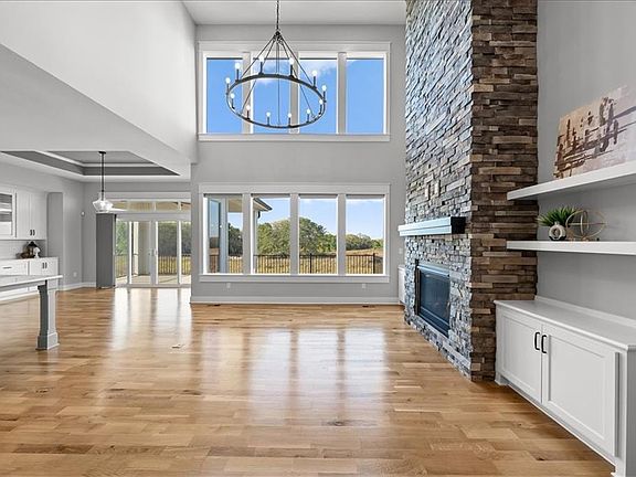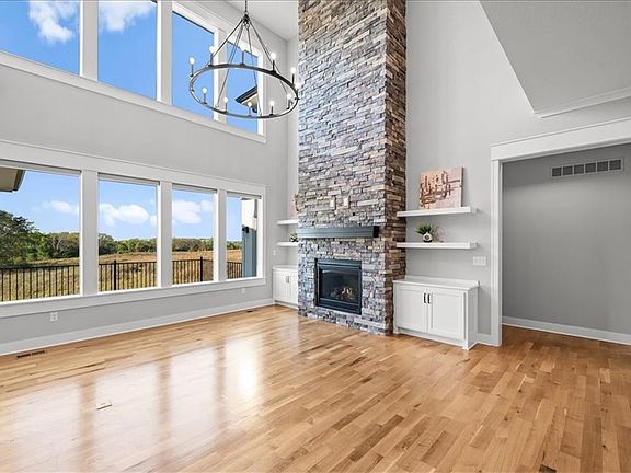 Unbeatable value in the Blue Valley School District! This stunning 1.5-story home is priced nearly $170K below county appraisal and offers exceptional space, style, and comfort. Highlights include a dramatic two-story stone fireplace, wide-plank hardwood floors, and a chef’s kitchen featuring an upgraded gas cooktop, massive walk-in pantry with a second oven, and custom cabinetry throughout. The main-level primary suite is a true retreat with peaceful views, a spa-inspired bath, and convenient laundry hookups just off the bedroom. Upstairs, each secondary bedroom includes its own walk-in closet and private bath for ultimate comfort and privacy—plus a second laundry area for added convenience. The finished walkout lower level expands your living space with a spacious rec room, wet bar, guest suite with ensuite bath, and an additional half bath. Step outside to the expansive, partially covered deck to enjoy beautiful sunsets and serene views. Community amenities include a resort-style pool, clubhouse, and fishing pond—all within minutes of top-rated schools, shopping, and dining. Quick closing available—don’t miss this incredible opportunity!