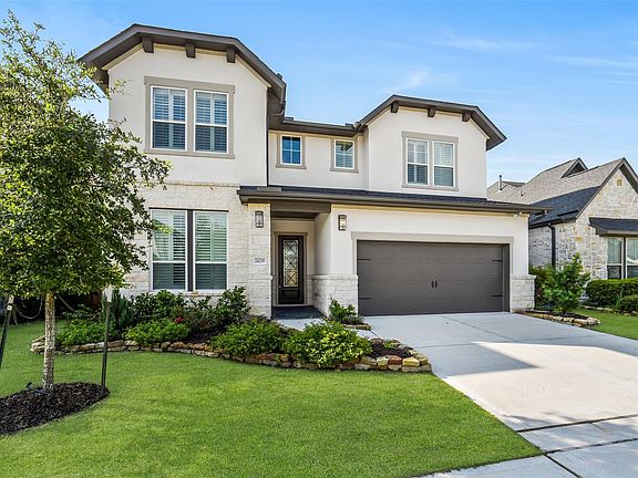 Stunning home located in an exclusive gated community! Zoned to highly sought-after Katy ISD schools including top-rated Seven Lakes HS. Step inside to discover a well-appointed design complete w/open-concept living, high ceilings, 5 bedrooms (2 are downstairs), 4 full baths, & a large gameroom. Wood flooring extends through the common areas, while custom shutters add an elegant touch throughout. The kitchen showcases sleek countertops, stainless steel appliances, a 5 burner gas cooktop, glass front cabinetry, a walk-in pantry, & a large island. The kitchen connects seamlessly to the dining & family rooms, & a dedicated home office w/a wall of custom built-ins provides the ideal work-from-home space. Luxurious primary suite includes a large walk-in closet. Outside, a covered & tiled patio overlooks the spacious backyard and greenbelt that has a water feature & paved walking trail. Ideally located just minutes from zoned schools, 99, Westpark, dining, shopping, & more.