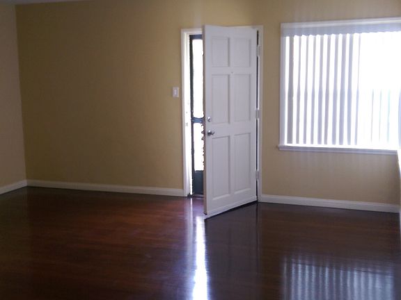 This l946 charming 2 bed. 1 bath duplex with rich mahogany wood floors is in a quiet friendly neighborhood close to the freeways and shopping centers. The kitchen and Dinning room have been recently redone with Spanish porcelain tile floors which highlight the white cabinets dark granite counter tops and back splash. A dishwasher and stove are also in the kitchen. A bar separates the kitchen from the dinning area where you can sit or use it as a serving counter. Decorator colored walls complement the white trim and dark wood floors. Well kept lawns with colorful plants and roses highlight the exterior. A shared 2 car garage is at the end of a long driveway. Off the garage in the backyard is a private laundry room with a covered patio for you to use.