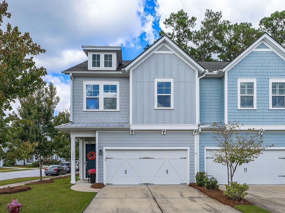 Welcome to 2422 Brackish Drive, the former Riverview model home with impeccable designer upgrades in the gated Dunes West Golf Club Community.Step into Lowcountry living at its finest in this stunning, end-unit townhome showcasing high-end finishes and thoughtful upgrades. Located on a premier wooded homesite at the entrance of Dunes West this 3-bedroom, 2.5-bath residence offers the perfect blend of luxury, comfort, and coastal charm.Built in 2019, this former model home is impressive with its large private lot (overlooking the rookery and green space), coastal architecture, spacious two-car garage, and manicured landscaping. Inside, a bright, open-concept plan welcomes you with hardwood floors, abundant natural light, stylish shiplap and custom details at every turn. The family room, dining area, and gourmet kitchen flow seamlessly which is ideal for everyday living and entertaining alike. This professionally wired "smart home" also features upgraded fixtures/fans and a 12 foot triple sliding glass door to the newly tiled back porch. The chef's kitchen is a dream, featuring upgraded KitchenAid stainless steel, counter depth appliances, a gas cooktop with hood, quartz counters, a tile backsplash, and an oversized center island with seating and built in storage. A drop zone and convenient powder room complete the main level. Upstairs, the versatile loft space offers the perfect spot for a home office, media room, or flex family space. The spacious primary suite includes wood flooring, shiplap, a walk-in closet and a spa-like ensuite bath with dual vanities and a large, tiled walk-in "super shower." Two additional bedrooms, a full hall bath, and a well-appointed laundry room provide comfort and convenience for family and guests and plenty of storage. Enjoy Charleston's year-round sunshine from the screened-in porch or unwind on the private backyard patio. As an end unit, this home also enjoys added privacy and expanded side yard green space perfect for pets, play, gardening and parking for guests. Residents of Riverview at Dunes West enjoy access to a private community dock ideal for fishing, kayaking, or evening get-together. Optional memberships to Dunes West Golf & River Club offer resort-style amenities, including multiple pools, tennis & pickleball courts, a state-of-the-art fitness center, dining, and one of the area's top-rated golf courses. In addition, you will find yourself just minutes from award-winning schools, upscale shopping, and dining, as well as the most beautiful beaches in the Lowcountry. Whether you're looking for a full-time residence or a lock-and-leave Charleston getaway, this move-in ready, low-maintenance home has it all.