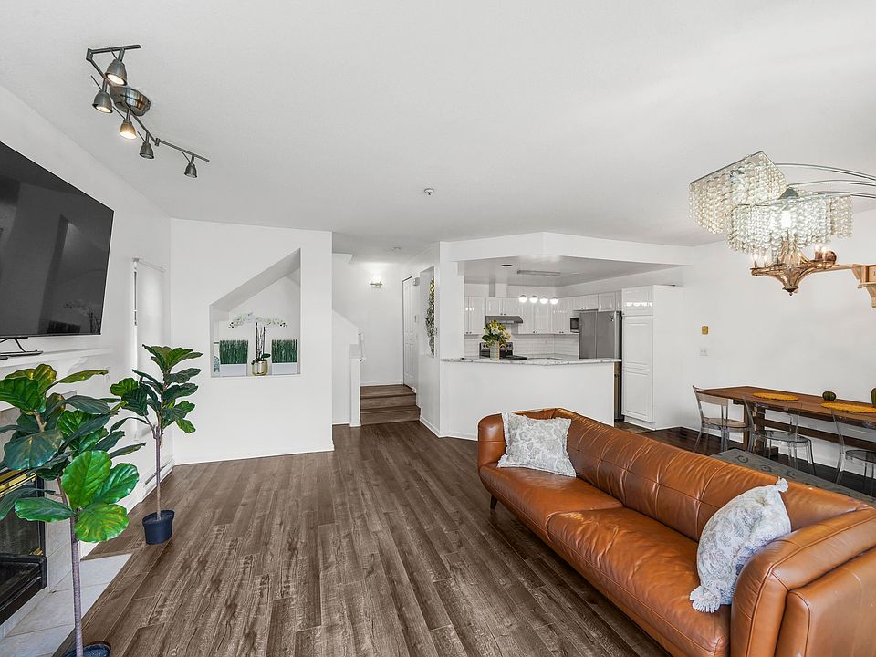 Corner Townhome Gem in Family/Pet Friendly, in Downtown Port Coquitlam! Spacious, well-maintained 2-bed, 2-bath, 1,181 sq ft home offers unbeatable walkability. Enjoy wood flooring throughout and an open-concept living area with gas fireplace. Large, bright, white kitchen has breakfast bar, S/S appliances, & pantry. The Primary BedRm accommodates King Bed & has a walk-in closet. 2nd BedRm also has a walk-in. Features: Large Private patio & 2-car tandem garage with storage. Walk to: West Coast Express, Community Parks, Multi-use trails, shops, dining, groceries. Family/Pet friendly complex in fantastic location. Excellent Schools: Central Elementary, École Pitt River Community, and Riverside Secondary. This townhome offers space, style, & unbeatable walkability for easy family living!