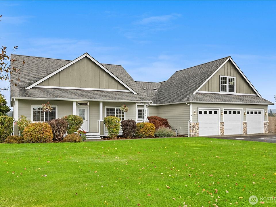 Welcome home to coveted Scatter Creek! This former model home has been tastefully updated and well taken care of. Beautiful hardwoods welcome you in to this primary on the main floor, open concept floor plan, lives like a ramble. Flowing floor plan includes 3 bedrooms and a large office with custom built ins. Primary has new 5 piece luxury bath and large walk in closet w/ custom built ins. The kitchen is a cooks dream with granite counters, gas range and large pantry. The three car attached garage also has adjacent rv parking. The outdoor entertainment space includes 2 large decks, 2/3 of an acre lot with fruit trees, raised beds, shed and a greenhouse. Enjoy the Mt. Rainier view and entertaining at this gorgeous home and community.
