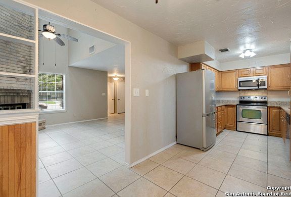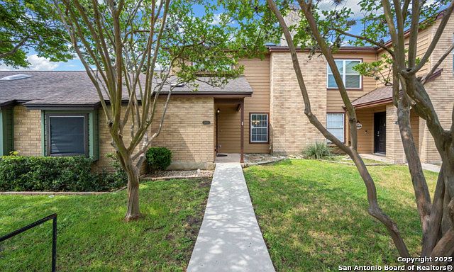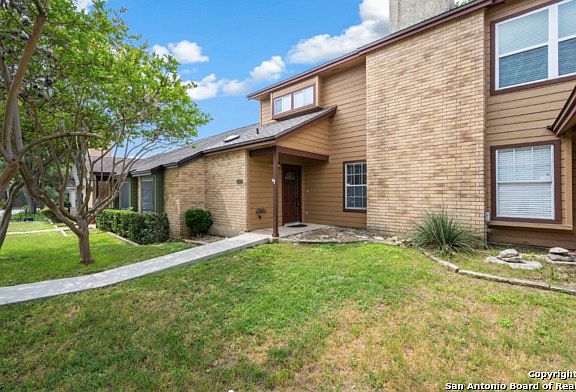 This beautifully upgraded townhome offers a blend of comfort, style, and convenience. Inside, you'll find sleek laminate flooring throughout and a modern kitchen featuring granite countertops, stainless steel appliances, and a refrigerator included. The spacious master bedroom boasts soaring ceilings and a dedicated HVAC unit for extra cooling comfort. Both the full and half baths are enhanced with granite countertops, and the washer and dryer are included for added ease. A two-car garage provides ample parking, while the covered back porch with a storage room is perfect for relaxing or entertaining. The home sits on a lovely lot, graced by blooming crape myrtle trees in the front and two majestic oak trees in the back, offering natural beauty and plenty of shade. Located in a peaceful, cozy neighborhood with easy access to the Airport, Downtown San Antonio, shopping and dining. This townhome delivers both charm and convenience. It is a must-see!