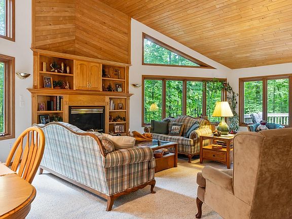 Gas fireplacePrivate sunroomSingle-level livingVaulted knotty pine ceilingOpen floor planBack deckCustom cabinets