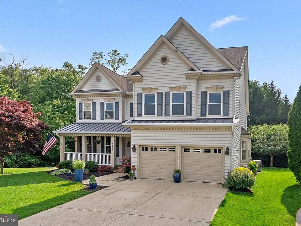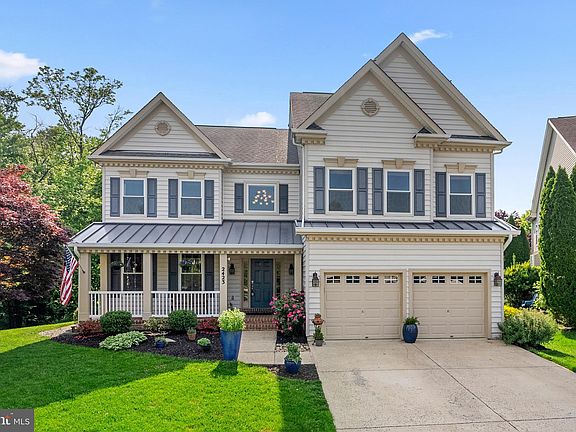 This exquisite craftsman-style home, situated on a premium, cul-de-sac lot backing to woods, is sure to delight! The thoughtful design of this home offers abundant storage throughout and features an impressive two-story foyer with convenient dual staircase, an ideally-positioned office/den with glass doors, formal dining room with large bay window, and oak hardwood flooring throughout the main level. The expanded kitchen, as heart and functional center of the home, boasts quartz countertops, a center island, and gas range, and combines with the bright and airy sunroom providing panoramic views of the backyard landscape. The open concept floor plan allows for excellent flow into the family room with a gas fireplace and access to the deck and garage. The upper level presents 5 generously-sized bedrooms, all with lighted ceiling fans. The owner’s suite has vaulted ceilings, skylights, a cozy gas fireplace, and en-suite bath with picture window, corner tub and separate shower. An entertainer’s delight awaits the new owner in the lower level, complete with recreation rooms and custom bar including wood surround, cherry cabinets and wall trims, pendant lighting, sink, dishwasher, back bar mirror, hardwired speakers and double-width stairwell leading up to the brick patio. The naturally beautiful setting offers scenic views of a creek running alongside the yard, the surrounding woods, adjacent pond and passing wildlife, including foxes, deer, geese and goslings, ducks, woodpeckers, hawks, and the occasional heron. Major upgrades include fully owned solar panels, backup generator, and Thompson Creek Low-E replacement windows and sliding glass door with transferable lifetime warranty. Easy access to Rts 50 and 32, along with local shopping and restaurants, including the Village at Waugh Chapel Shopping Center!