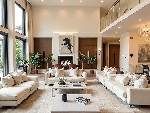 Two-story fireplaceSecond-level fireplaceLarge center islandHigh-end finishesGreat roomCovered loggiaOutdoor living