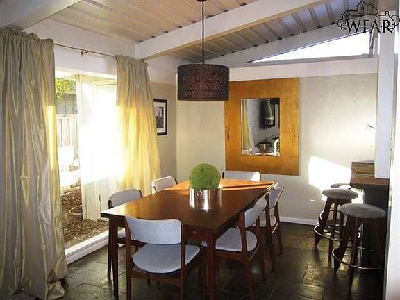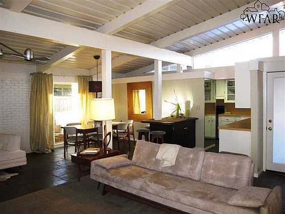 Unique mid-century modern home in Country Club Cottages. Open floor plan features tall ceilings, handsome slate flooring, a wood-burning fireplace and floor to ceiling windows providing lots of natural light. Kitchen features excellent cabinet space and stainless steel appliances. Master suite features two closets and a private bath. Two additional bedrooms are spacious and feature generous closets. Beautiful backyard features a patio, privacy fencing and mature trees. A rare find!
