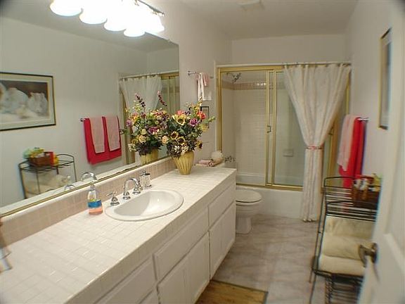 Spacious, Open, Bright, and Move-in condition. Three bedroom, two bathroom, 1,707 square foot, end unit, corner location town home with an abundance of storage areas in a great neighborhood. Large kitchen that opens into the formal dining area. Breakfast counter just off the kitchen that opens into the huge living room. The kitchen has bright white tile counter tops, the living room has vaulted ceilings, a cozy gas fireplace and French doors out to the spacious balcony. Wonderful master bedroom with vaulted ceilings, full length mirrored closet, private bathroom with tiled sink, bathtub, and separate shower. Direct access to the attached two car garage just off the interior laundry area. Two bedrooms and a full bathroom on the main level. Hardwood floors, plantation shutters, forced air heating, recessed lighting, and double pane windows. Pre-wired alarm system and also wired for high speed internet access through FiOS (Fiber Optic Technology). Yard on the side of the unit could be fenced off for a private backyard area. Refrigerator, washer, dryer, and microwave are all included. Conveniently located close to schools, parks, shopping, restaurants, and freeways. Beautiful home and location make this a wonderful place to call home.