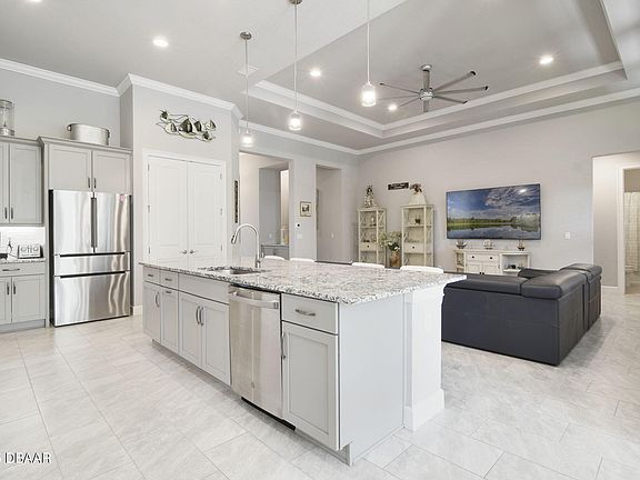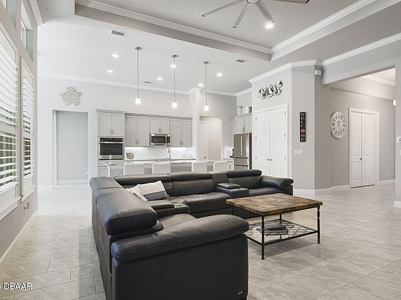Welcome to Brown's Landing, one of Port Orange's most prestigious gated communities. This stunning four-bedroom, three-bathroom estate home with an additional office and a spacious three-car garage offers both elegance and comfort. As you arrive, you'll be impressed by the paver driveway and lush tropical landscaping that create an inviting first impression. Step inside to find upgraded tile flooring and an open, light-filled floor plan that's perfect for modern living. Refined touches such as plantation shutters, crown molding, and 8-foot doors throughout the main living areas showcase the home's exceptional craftsmanship. The gourmet kitchen is a chef's dream, featuring gray shaker wood cabinets, granite countertops, a stylish tile backsplash, under-cabinet lighting, and pendant lights over a large island with a breakfast bar—ideal for entertaining family and friends. The kitchen flows seamlessly into the dining and great rooms, creating a bright and welcoming atmosphere. The split-bedroom design ensures privacy, while the primary suite provides a serene retreat complete with a tray ceiling, generous walk-in closet, and a spa-inspired bath. Step outside to the oversized screened lanai, the perfect spot for barbecuing, relaxing, or enjoying your morning coffee. The fenced backyard offers plenty of space to play or unwind in complete privacy. Ideally located near top-rated schools, shopping, restaurants, golf courses, and the beautiful beaches of Daytona, this home truly has it all. Schedule your private showing today!
